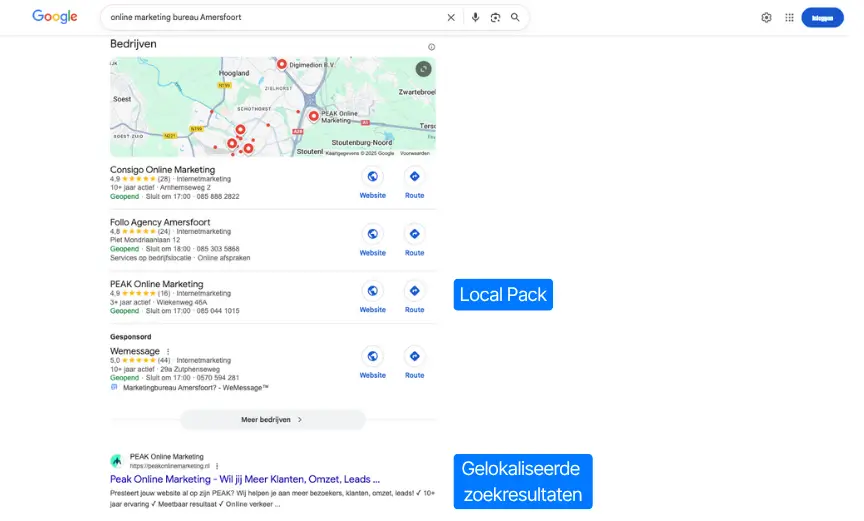 Het Local Pack verschijnt vaak direct bovenaan op mobiel — nog vóór de reguliere organische resultaten.