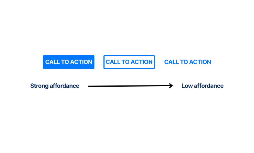 In UX-termen noemen we dit affordance: de mate waarin het ontwerp van een element uitnodigt tot interactie. Een knop met strong affordance is visueel duidelijk klikbaar. Bij low affordance moet de gebruiker gokken — en dat kost je clicks.