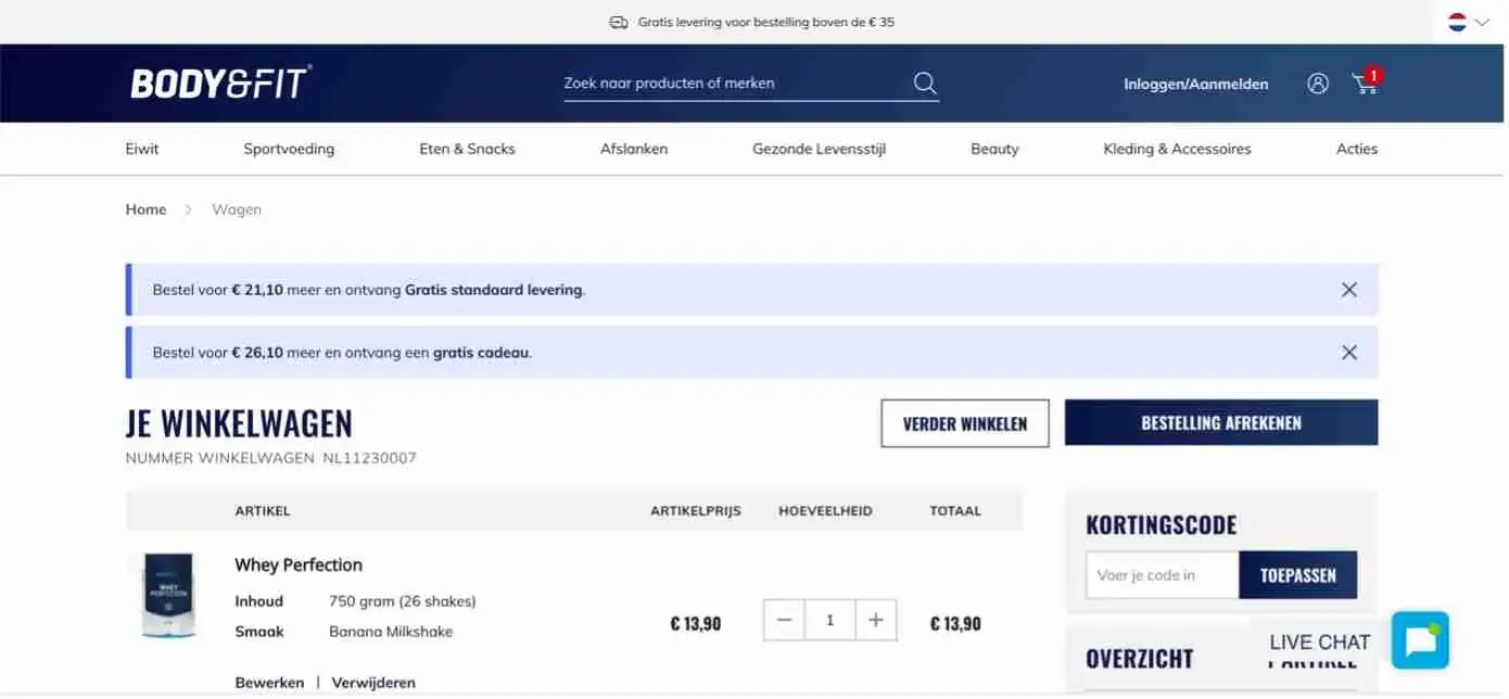 Body & Fit pakt het slim aan: bovenaan de winkelmand zie je precies hoeveel je nog moet toevoegen om gratis verzending of een extra cadeau te krijgen. Transparant én activerend.