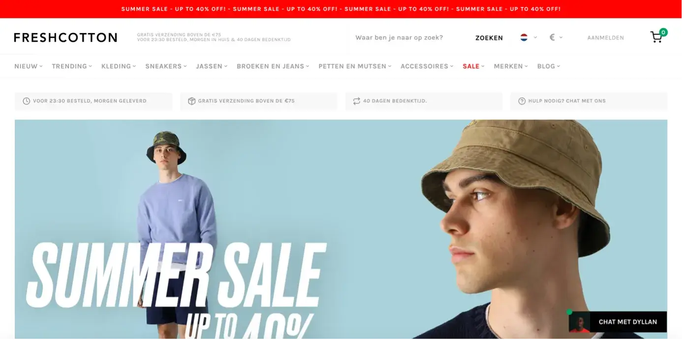 Freshcotton laat zien hoe het moet: een vriendelijke, persoonlijke chatoptie met een naam en gezicht. Geen bot, maar een mens. En dat voelt meteen betrouwbaarder.