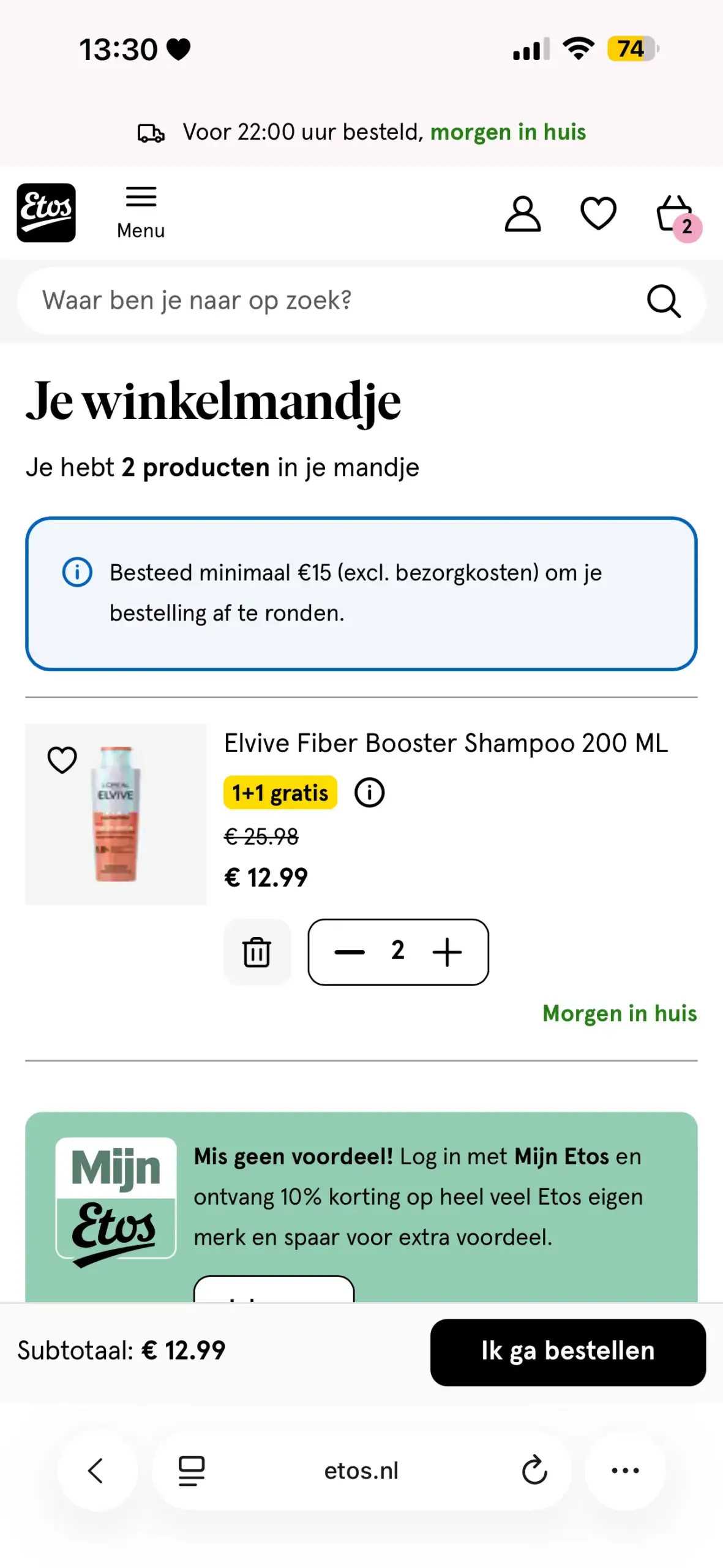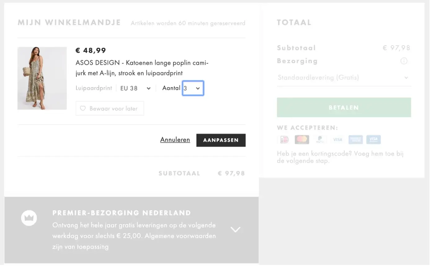 Etos snapt dit principe goed. Op mobiel blijft de knop ‘Ik ga bestellen’ altijd onderin het scherm zichtbaar, zelfs als je meerdere producten in je winkelwagentje hebt. Een goed voorbeeld van hoe je de drempel tot afrekenen zo laag mogelijk houdt.