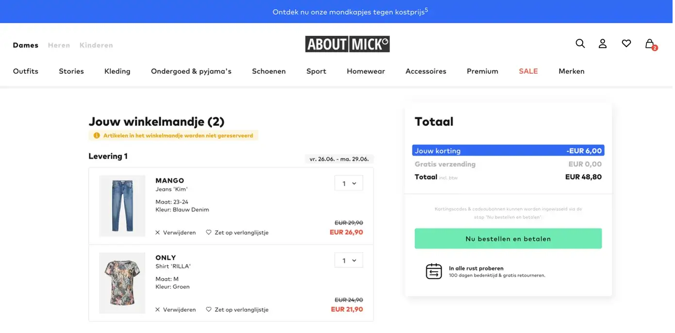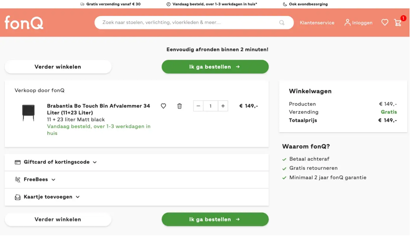 FonQ doet dit goed: in de winkelwagenpagina benadrukken ze direct dat retourneren gratis is. Geen kleine lettertjes, maar gewoon duidelijk zichtbaar op het juiste moment — als de klant op het punt staat te beslissen.