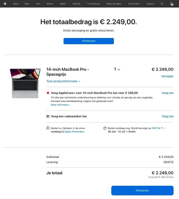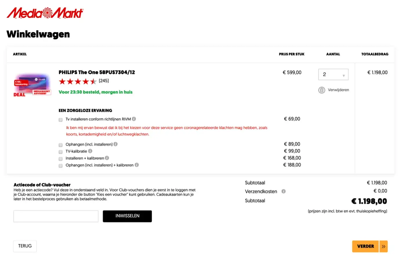 MediaMarkt toont onderaan de winkelwagen duidelijk dat het totaalbedrag inclusief BTW is. Geen kleine lettertjes, geen twijfel. Gewoon helder.