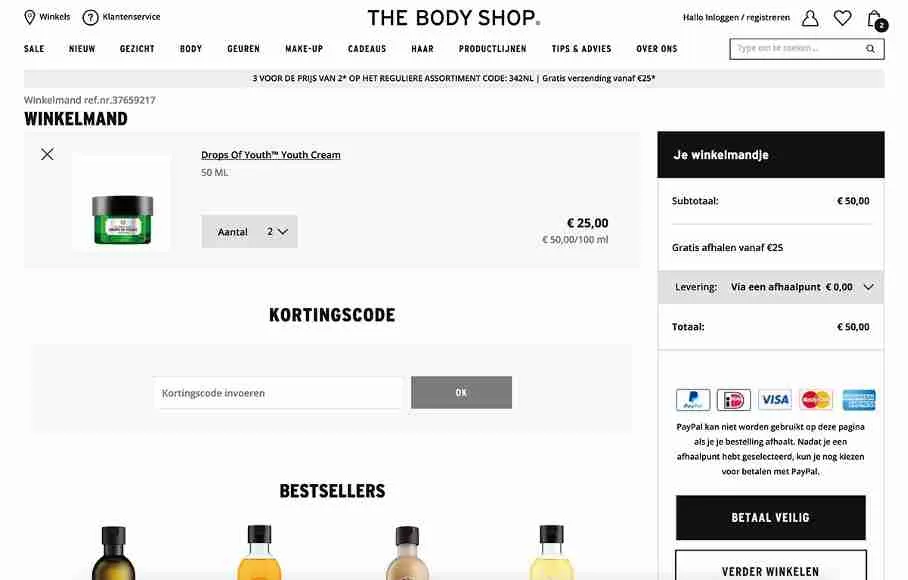 Bij The Body Shop staat het kortingscodeveld direct en prominent in beeld. Als je daar geen code hebt, voel je je bijna achtergesteld. En dat wil je vermijden — tenzij je continu met kortingsacties werkt en mensen dat verwachten.