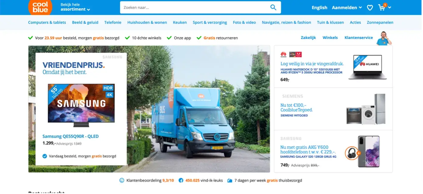 Coolblue maakt het nóg simpeler. De verzendkosten zijn standaard gratis en dat communiceren ze op meerdere plekken — onder de zoekbalk, naast het totaalbedrag en in de check-out. Dat geeft rust én vertrouwen.