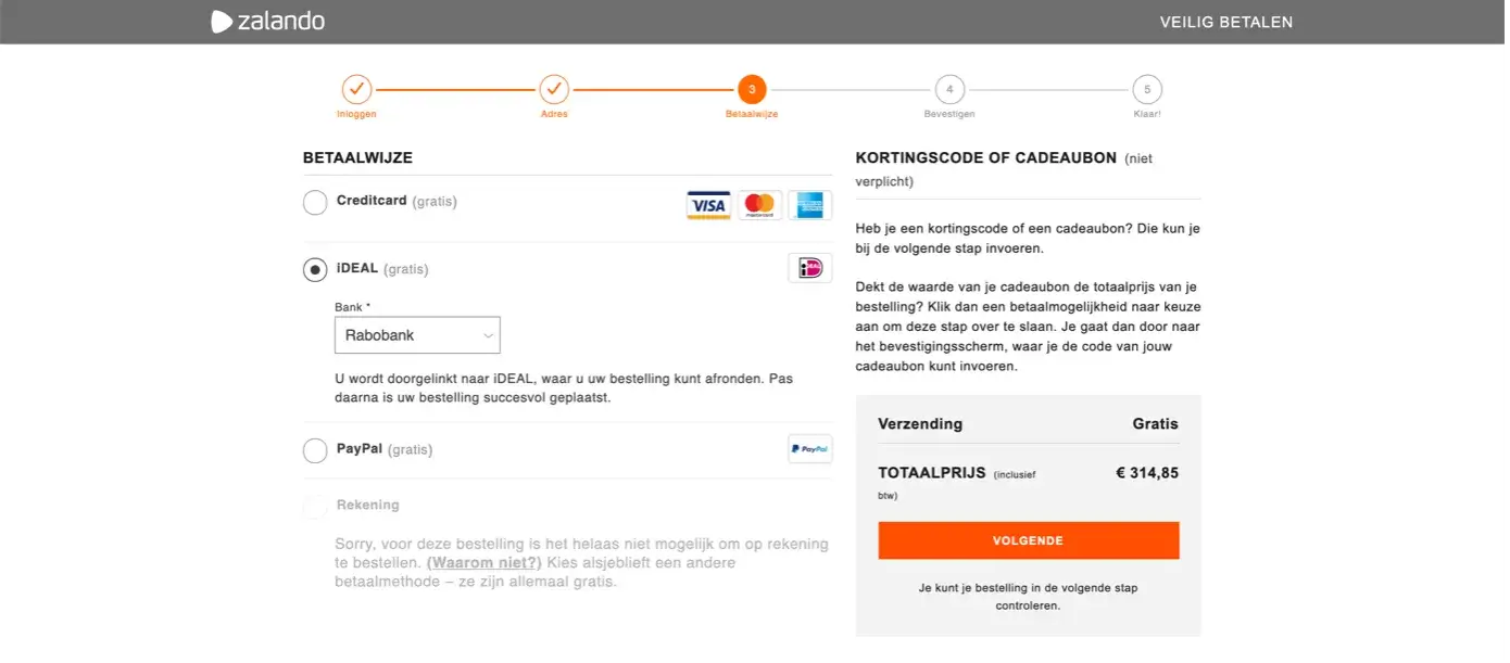 Zalando maakt in de checkout korte metten met afleiding: strakke layout, minimale navigatie, alle focus op afronden. Clean = conversie.
